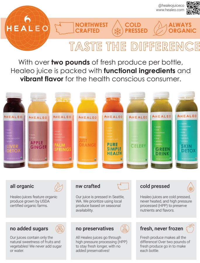Taste the difference with Healeo’s organic juices! Northwest crafted, cold-pressed and always organic!