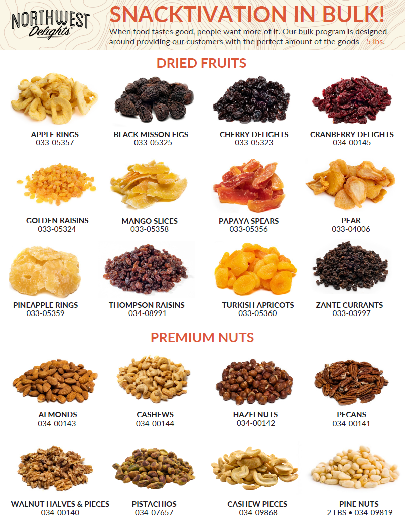 Nature’s World has been producing some of the most delicious & healthy premium snacks from trail mix, to dried fruit and mixed nuts since 1987! You may recognize their products in the Northwest Delights label as a staple in the Northwest, but did you know you can now order their premium dried fruits and nuts in bulk? Browse available products today!