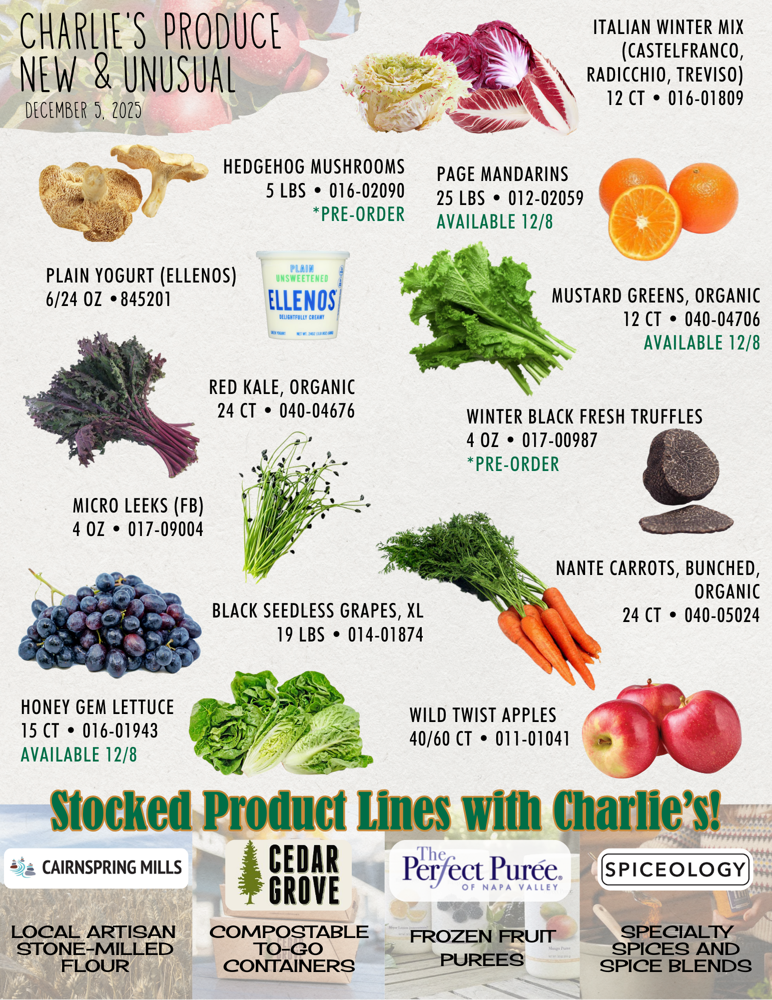 Fun and fresh this week are Hedgehog mushrooms, Italian winter mix chicories and XL black seedless grapes! See the full New & Unusual flyer for more.