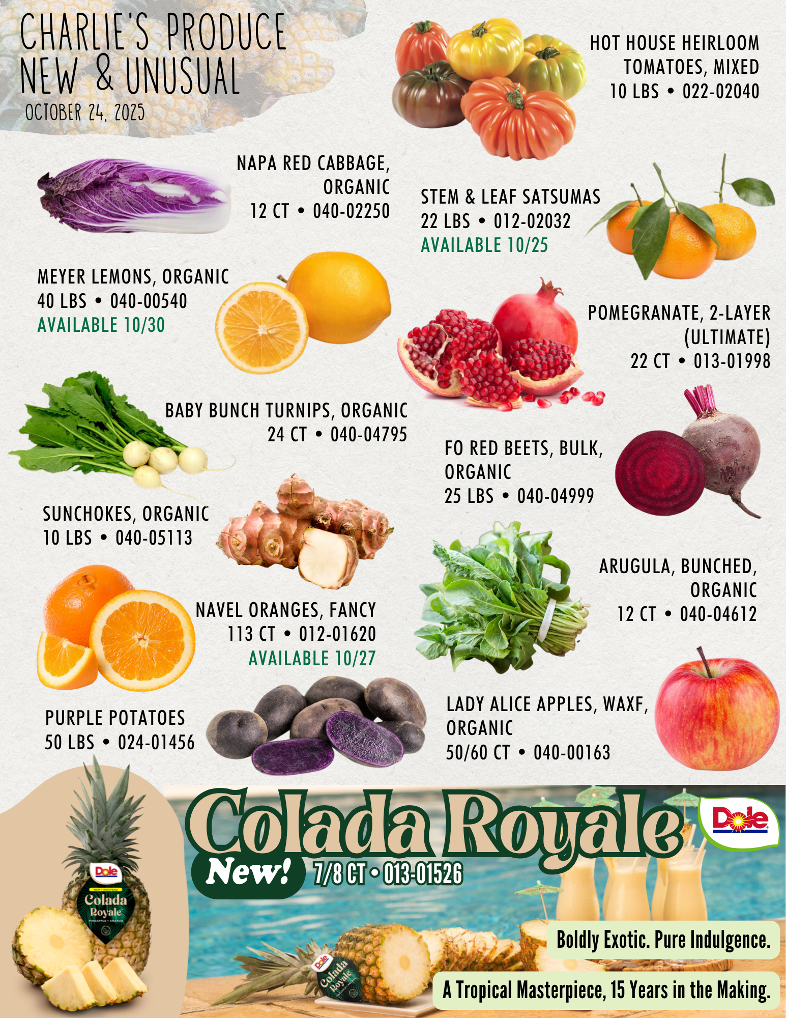 We’re getting caught in the rain in the best way – on this week’s flyer we’ve got Dole’s brand new pineapple, the Colada Royale! We’re first to market on this beautifully delicious product, and we couldn’t be more excited. View the full New & Unusual to see the rest of this week’s fresh offerings!