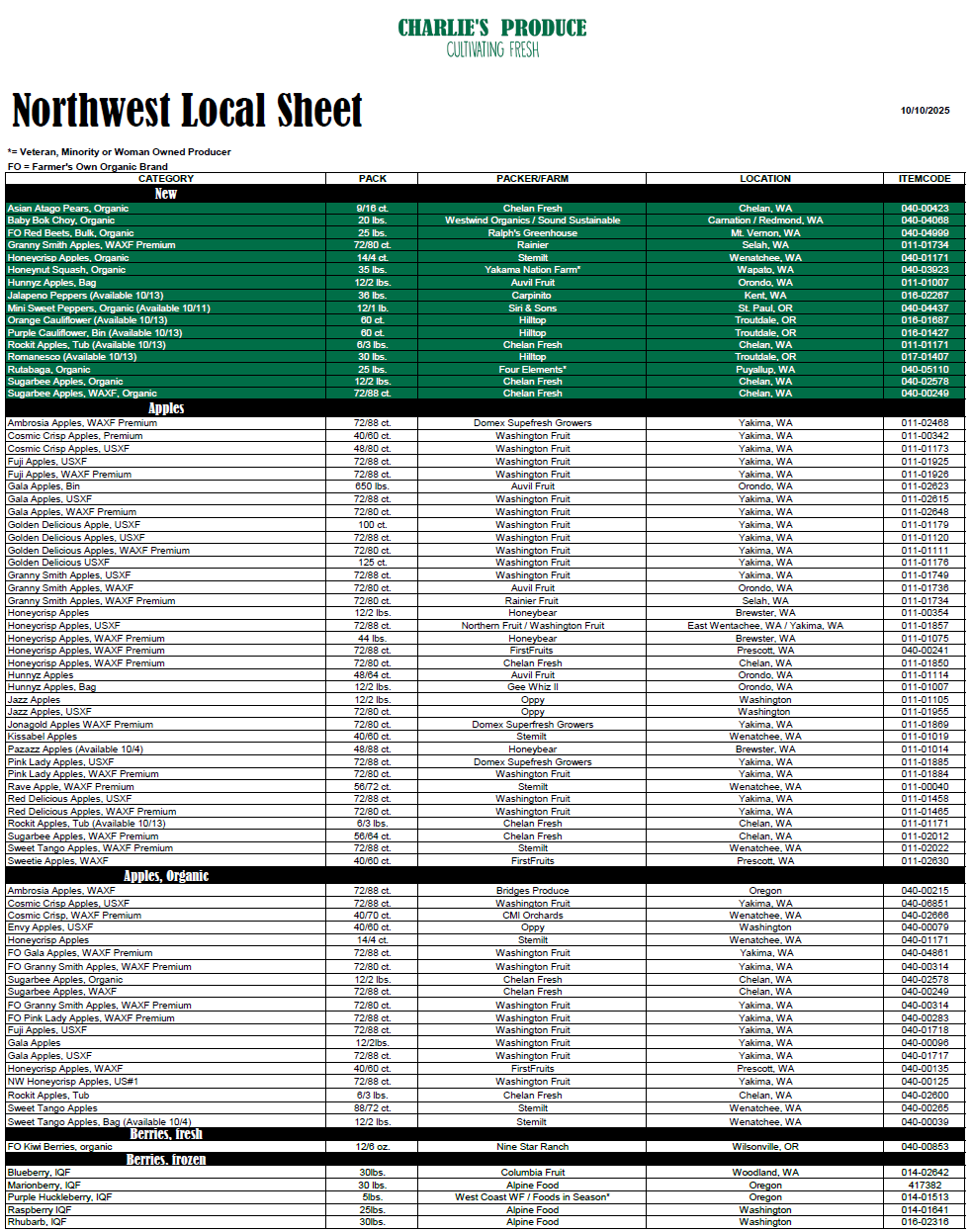 New this week in the Northwest we have Farmer’s Own organic red beets from Ralph’s Greenhouse (Mt. Vernon, WA), organic Asian Atago Pears from Chelan Fresh (Chelan, WA), organic purple and orange cauliflower from Big Sage Organics (Othello, WA) and more! Browse the sheet to see all of our local offerings.